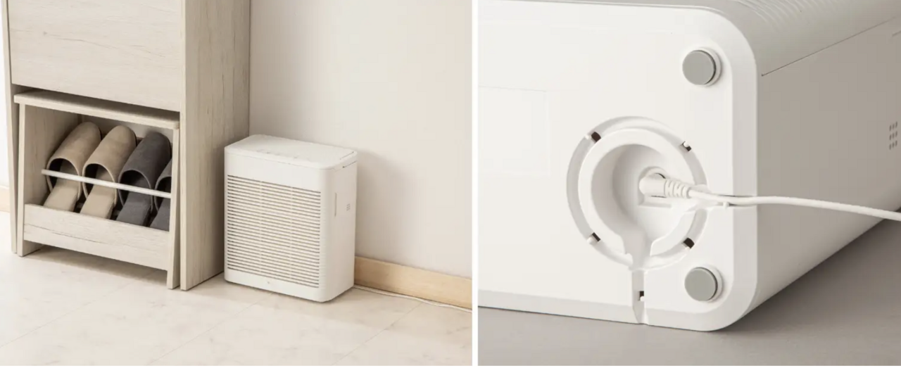 玄関や脱衣所など、限られたスペースでの花粉対策に最適なのが「スリム空気清浄機(NR-402 ホワイト)」。奥行きわずか150mmというコンパクトな設計に加え、電源コードを底面から引き出す構造にすることで、壁際にぴったりと寄せて設置できるよう配慮されています。