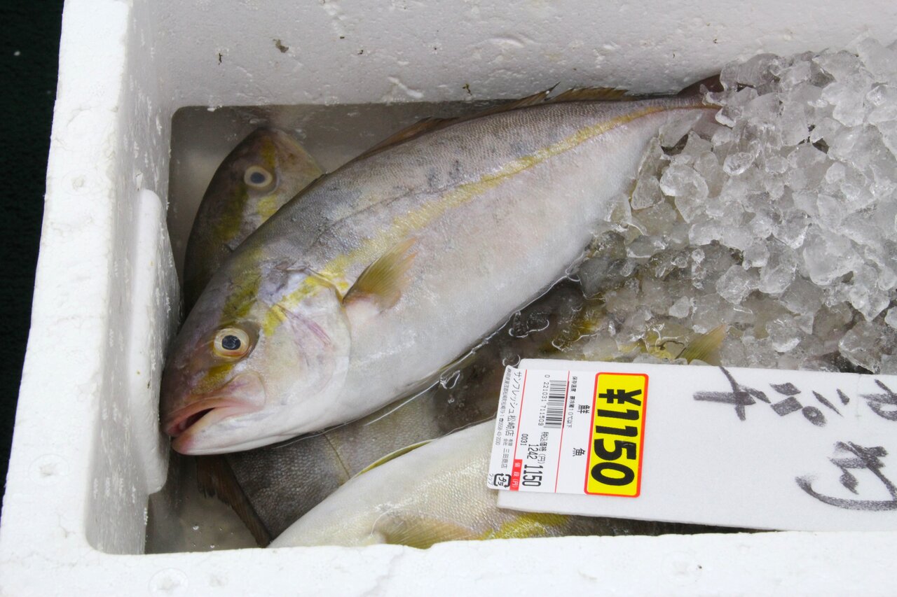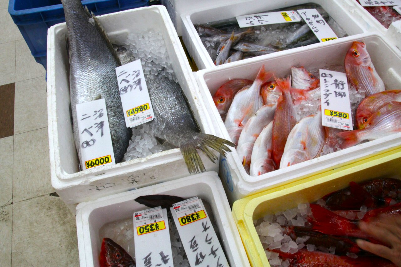 サンフレッシュは地元に根付いたスーパーで、松崎店では地元の漁師さんから仕入れた魚をはじめ、さまざまな地域の新鮮な魚が丸のまま販売されているコーナーがあります。この日は沼津や南伊豆産の魚も並んでいて、どれも新鮮そうな魚ばかり。