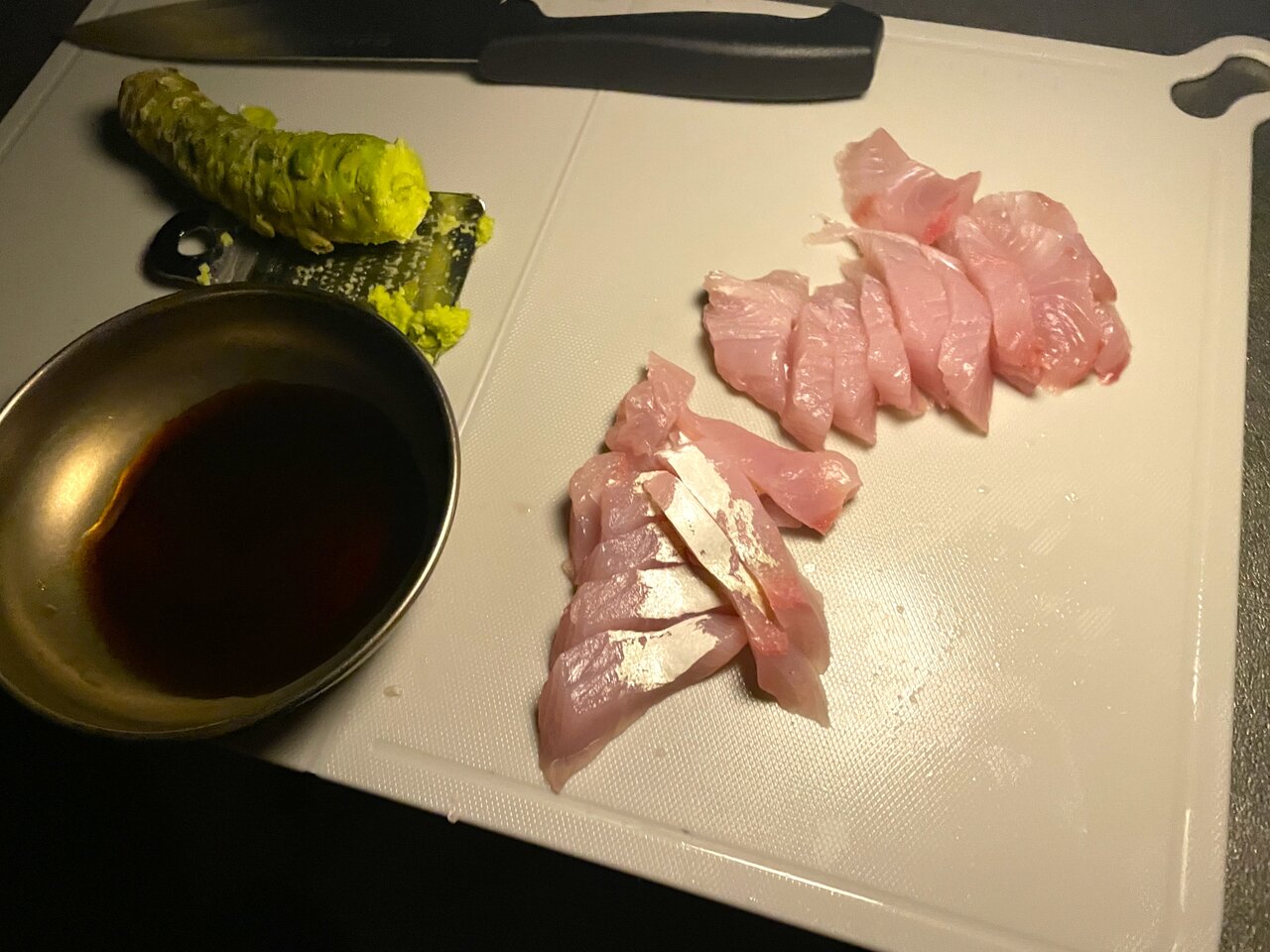 カンパチを捌くのは初めてで不安だらけでしたが、何とか形になりホッとします。自分で捌いた刺身を味わってみると、しっかり旨味があって、臭みはなく、味にも感動! ワサビの香りが強く、普段口にしている物とは違う贅沢な味です。