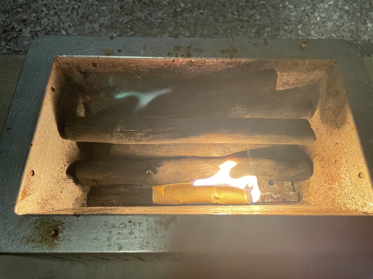 燃料店のご主人から「着火剤を使って熾した方が良い」と言われたので、アドバイス通りに着火。備長炭は火を熾すまでに時間がかかり、急激に温度が上がると爆発して跳ねる危険がある、ということが理由かもしれません。