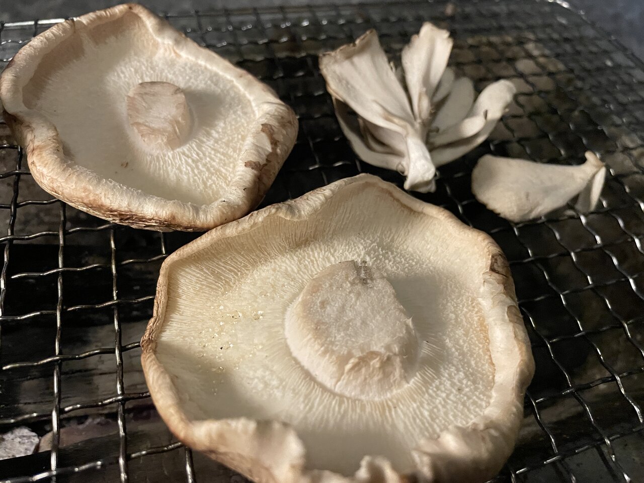 備長炭は煙が少なく、脂分がないきのこ類も煙が出にくく、炭火に適した素材だと思います。網に載せると徐々に水分が染み出してきて、滋味深い香りが漂ってきます。ただ、この日は炭が完全に赤くなる前に焼き始めてしまったので、やや水分が飛び過ぎてしまいました。備長炭は焼き始めの時間を計算して、時間に余裕を持って熾した方が良さそうです。