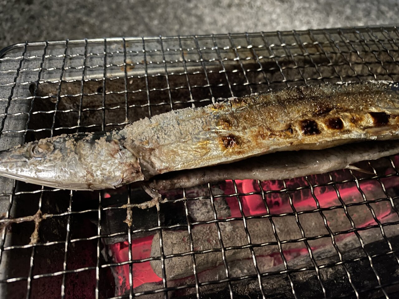 きのこを焼いている間にしっかりと炭熾しができたので、メインのサンマを網に乗せます。数秒するとじりじりと皮が焼ける音が鳴り、細かな脂の滴が炭に飛び、燃えた部分がイルミネーションにようにピカピカ光っていました。