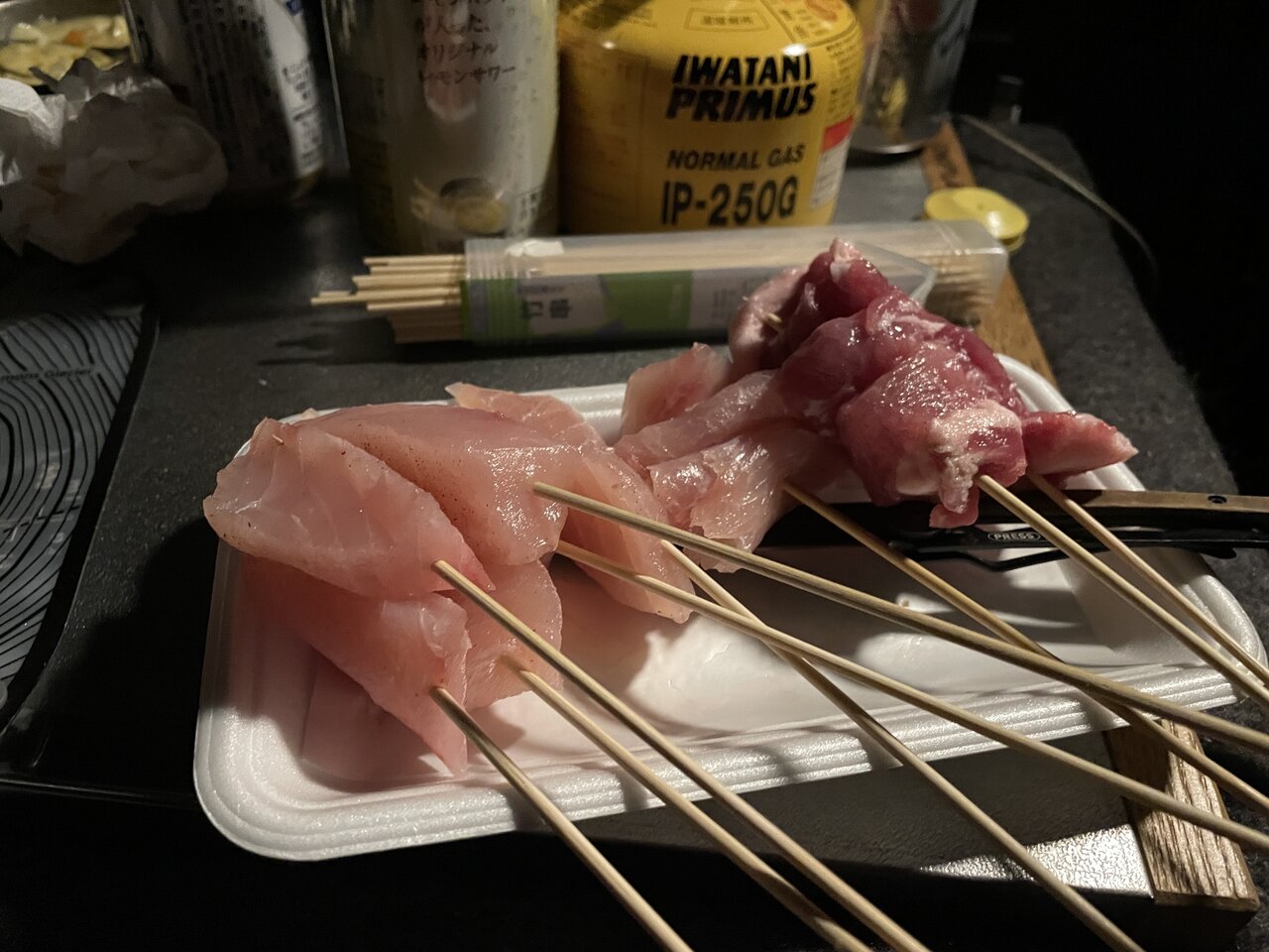 夕食は揚げ物が食べたかったので、串揚げにしました。油跳ねを気にしなくていいので、家よりアウトドアのほうが揚げ物がしやすいかも。