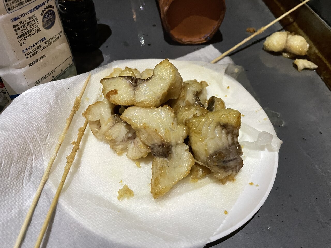 先ほど購入したうなぎで乾杯。捌きたて焼きたての味は格別で、ふわふわした身と脂が最高でした! これほど新鮮なうなぎを食べるのは初めてで、とても良い経験になりました。自宅に備長炭があるので、次回は自分で炭火焼きをしてみたいという意欲も湧いてきました。