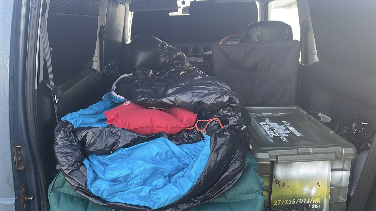 先月の車中泊ではまだ寒さを感じなかったので、同じ装備で寝ていましたが、ひと桁台の気温では寒さを感じて目覚めてしまいました。保温力不足は寝袋だけではなく、ベッド部分にもあって底冷えする感じ。テントではないので下はあたたかいだろうと思っていましたが、車中泊でも寒さ対策は万全にする必要がありそうです。