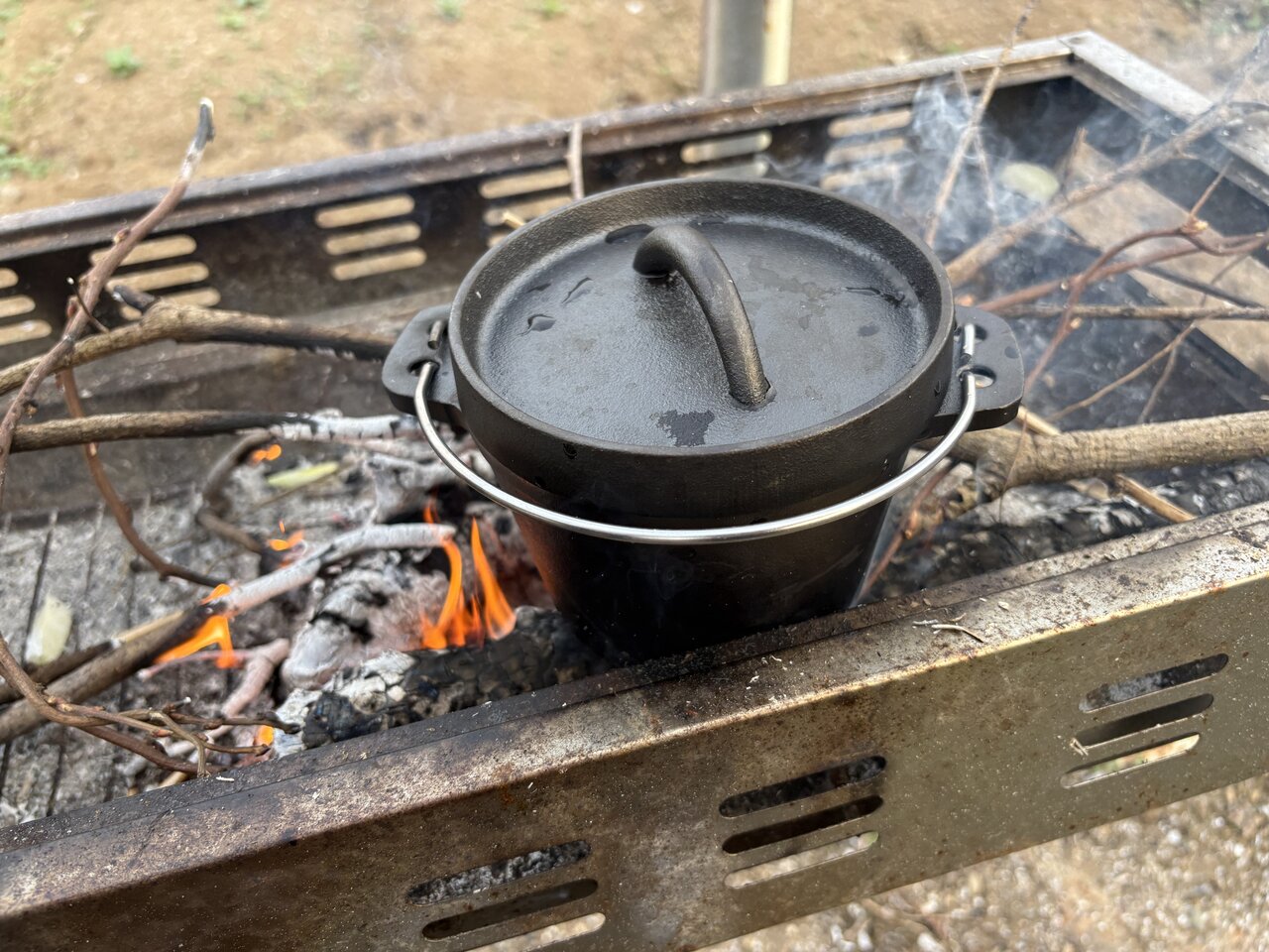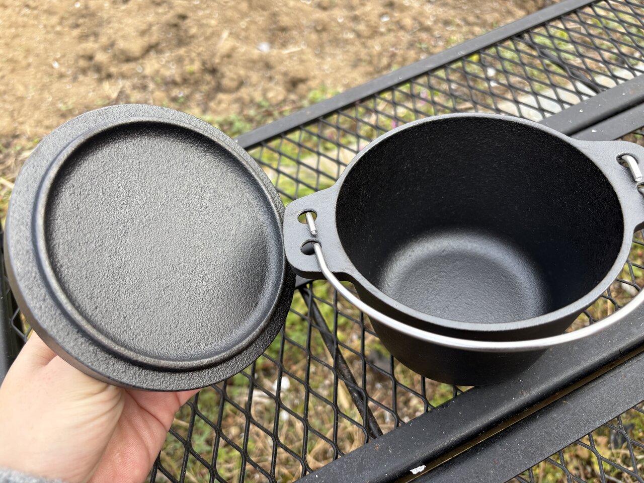本体の重さは約1.5kg。持ち上げてみると、ずっしりとはしていますが、構え直すほどではありません。火の上へ運ぶ動作も、気負わずに済みます。見た目は小ぶりですが、その分、置き場所に悩まないサイズ感。いわゆる本格派アイテムと比べると、存在感は控えめです。ただ「まず火にかけてみる」には、ちょうど良いサイズだと感じました。