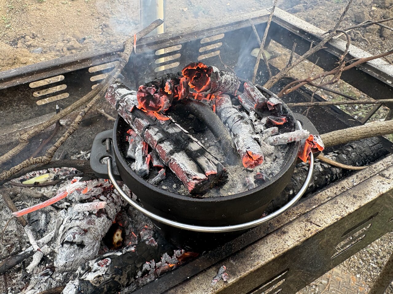 火のそばで鍋を見守るのが楽しいダッチオーブン時間