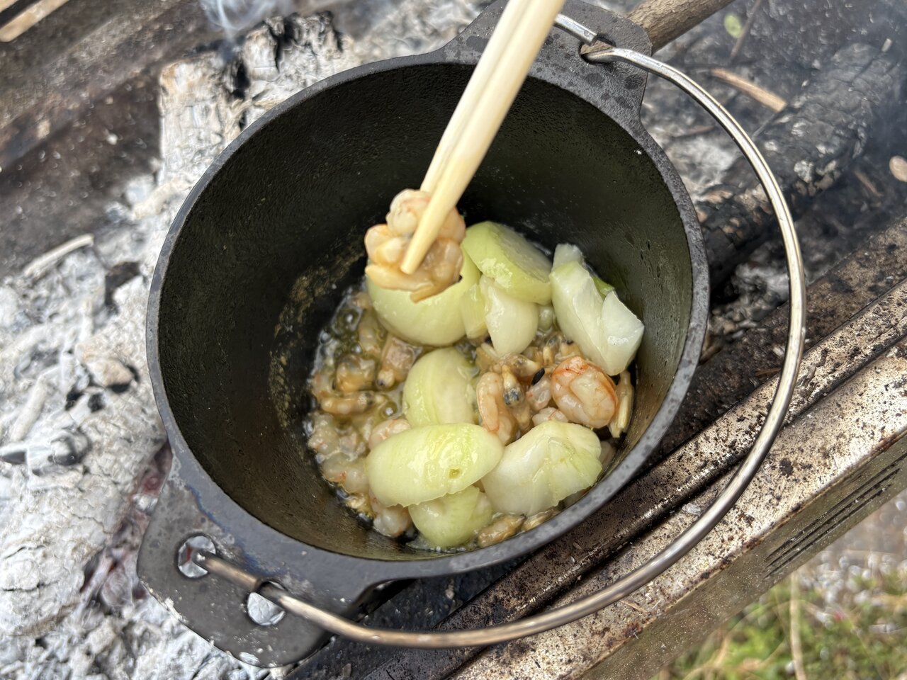 今回は蓋の上にも薪を置き、上下からじんわりと熱を入れていきました。しばらくすると、オイルが静かに揺れ始め、にんにくの香りが立ち上ります。鋳鉄製のダッチオーブンらしく、温度の立ち上がりは緩やか。