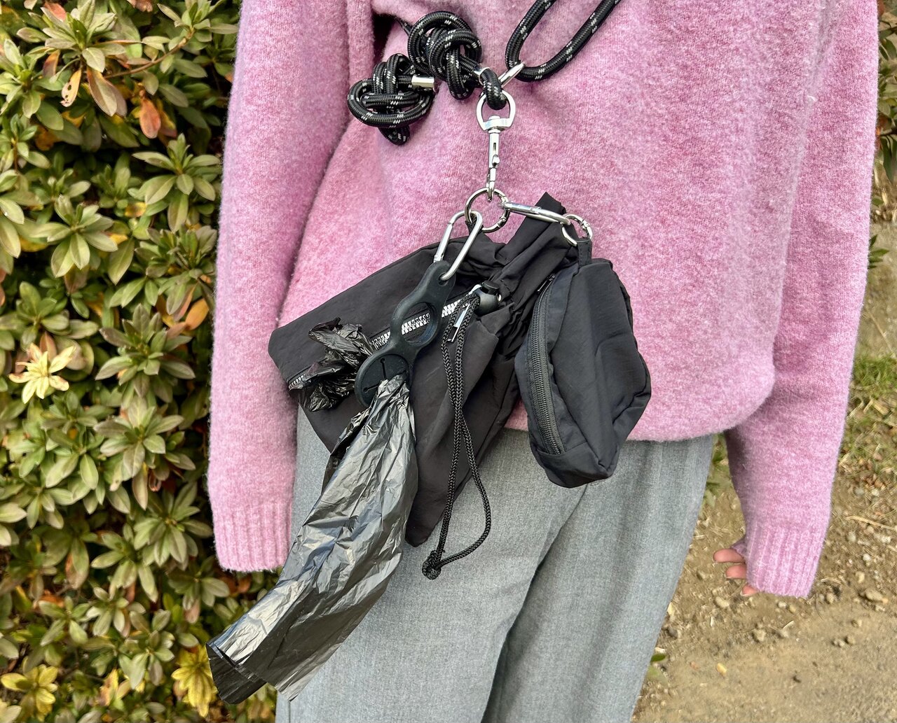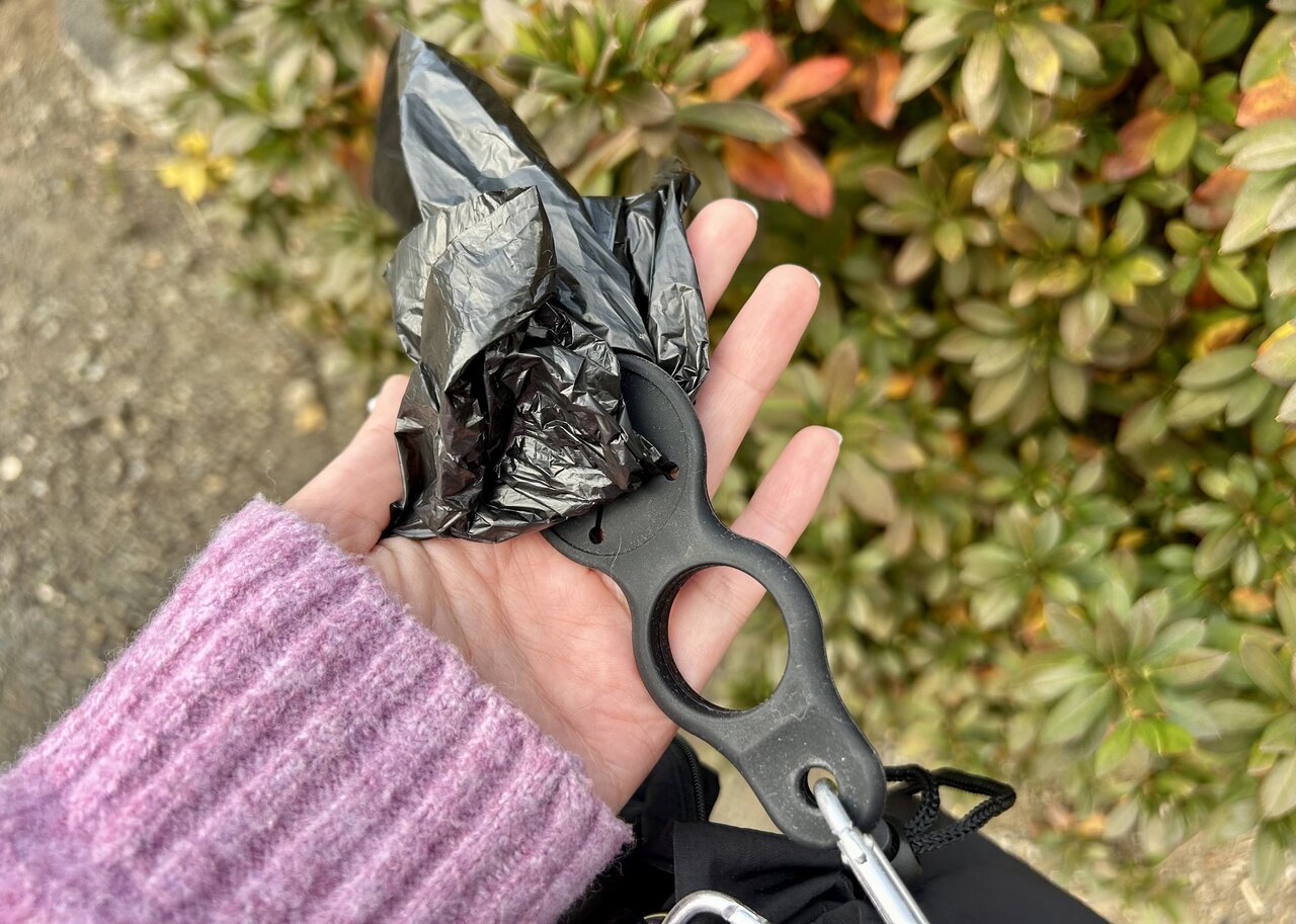 ペットボトルのほかにも、マナー袋を挟んで装着できる仕様に。散歩中の排泄物やちょっとしたゴミをスマートに回収しています。1つの袋にまとめられるので、帰宅後の処理がグンっと楽になりますよ。