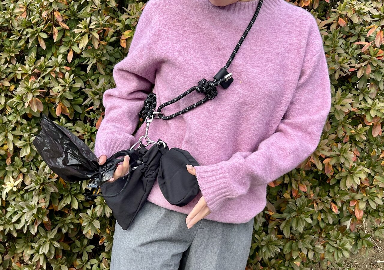 広い公園ではスマホやいつもの散歩グッズのほかに、一緒に遊ぶボールやロングリードなど様々なものを持っていきたいものですが、上着のポケットだけでは足りません。そこで、3COINSの「お散歩ショルダーセット」を使ってみました。これはポーチ、ペットボトルホルダー、巾着がセットになっています。