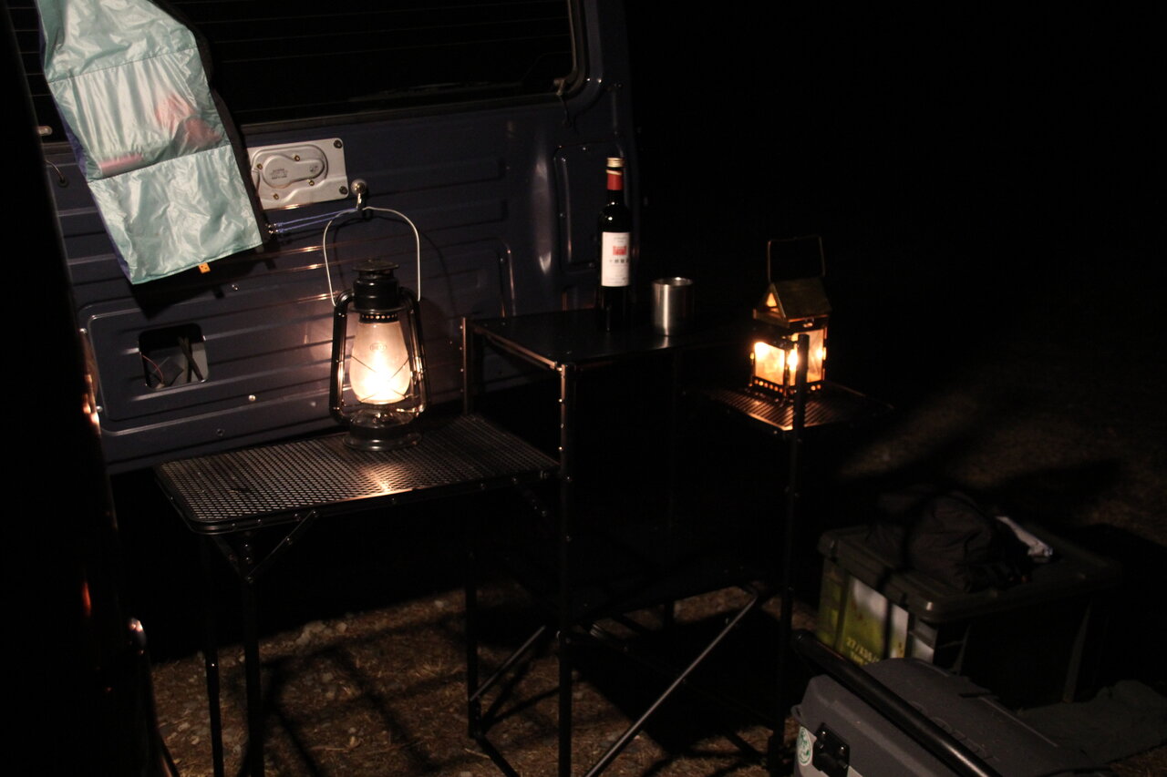 オイルランタンを置いて、バーカウンターのようなムードある空間を作ってみました。最初の画像のような夜景のシーンにこの空間があれば、より楽しめたと思います。海を眺めながら酒を飲んでも良いかもしれません。イメージが広がります。