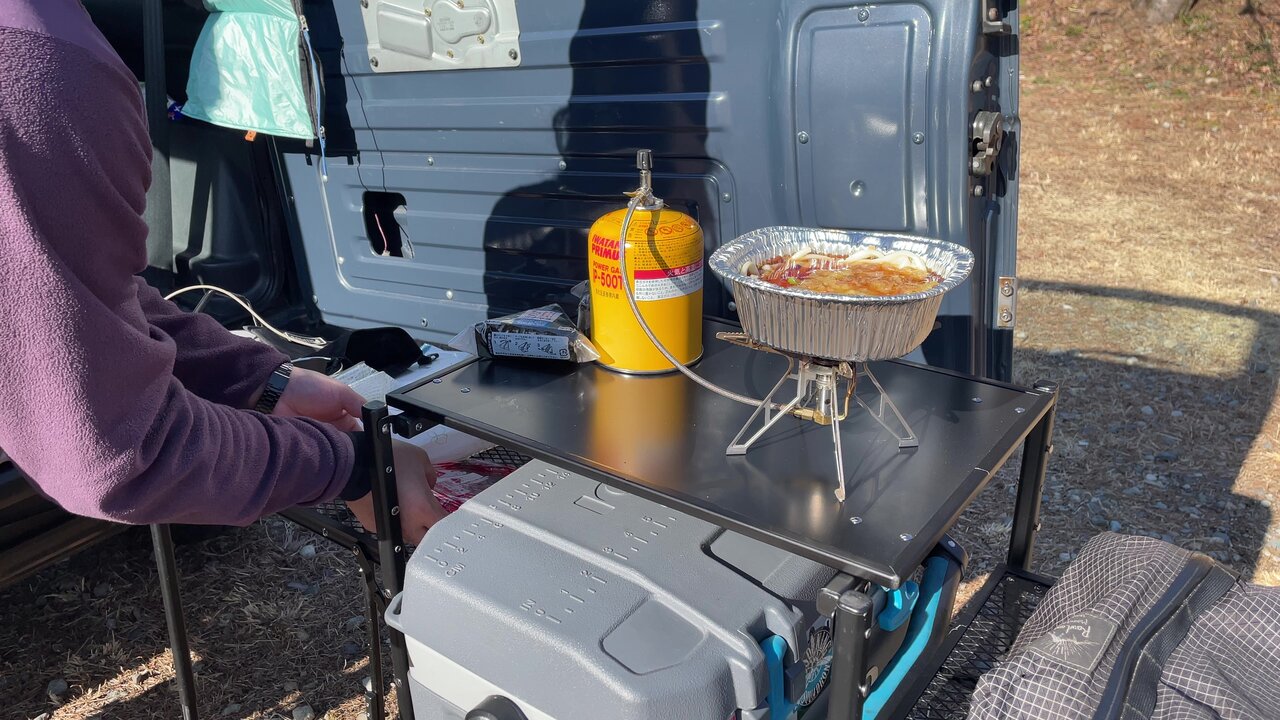 トランクに座ってテーブル代わりに使ってみたものの、高さが合わず食べにくかったです。中央の天板なら高さが合いそうだけど、レイアウトを変える必要があります。またある程度スペースをとるので冬キャンプの際に荷物がさらに増えた際、車載しにくくなるので、全体的な装備の見直しが必要になるかもしれません。