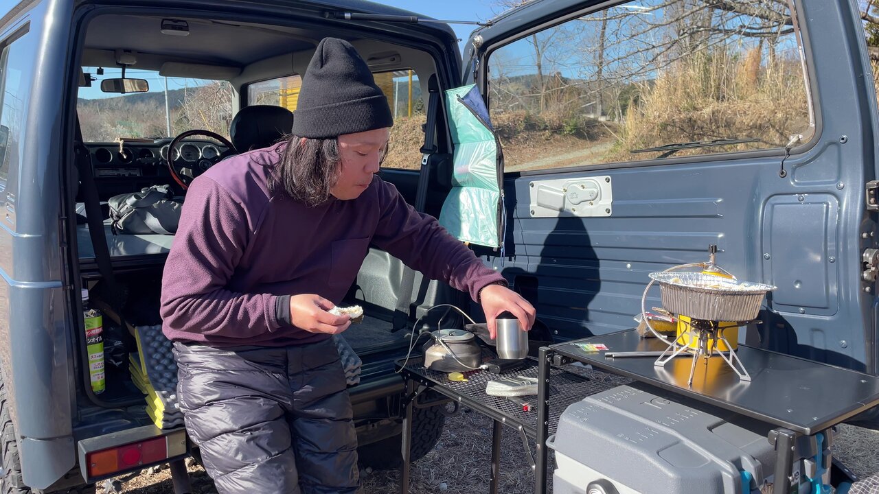 ジムニーのバックドア開放スペースで景色を眺めるのがお気に入りの筆者。より快適に、オリジナリティのある空間にするため、タフライトスタンドを購入。ジムニーとの相性や使い勝手はいかに?