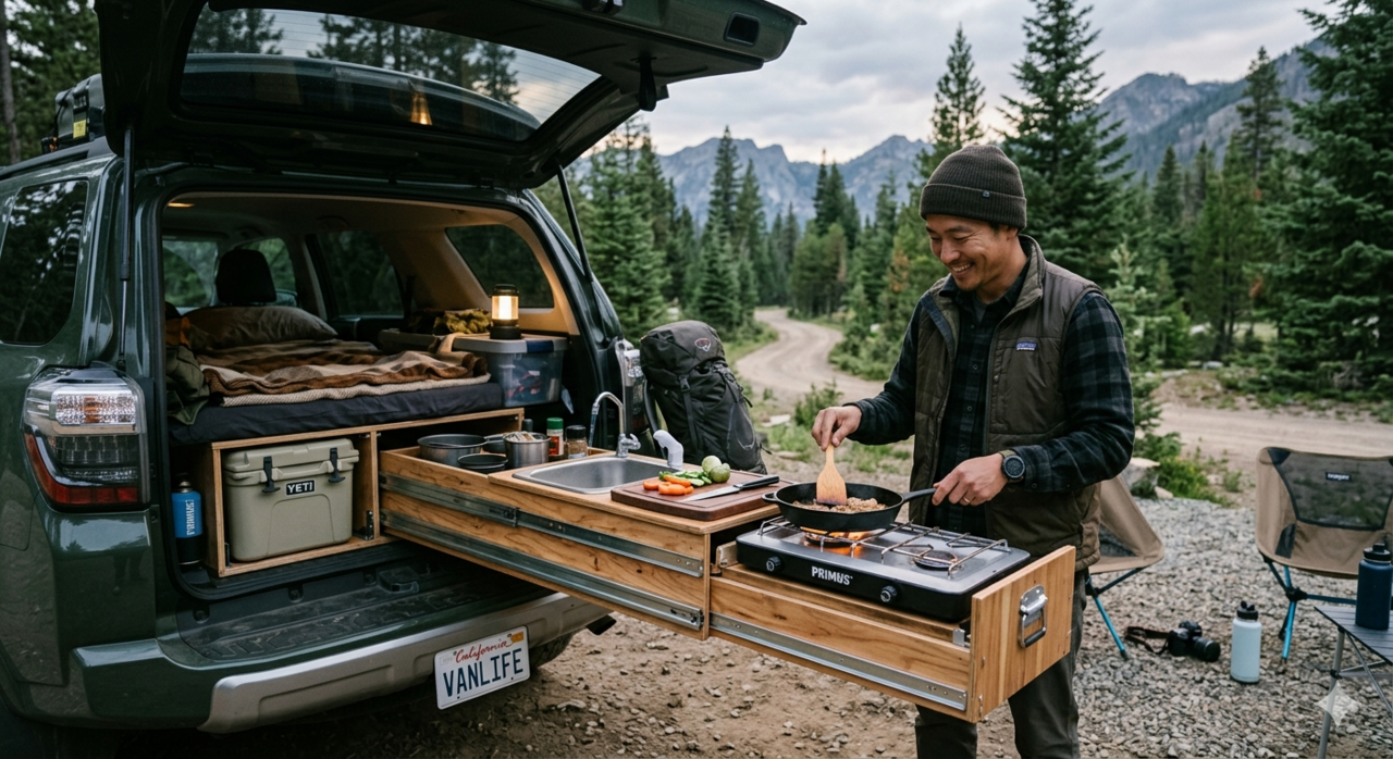 なんとなくイメージしていたのは、欧米のバンライファ―の間で定番となっている引き出し式のキッチンシステム。スペースがないジムニーではまず設置不可能ですが、後部スペースにこんな快適空間を生み出したいと考えていたところ、ニーズに合ったスタンドを発見しました。
