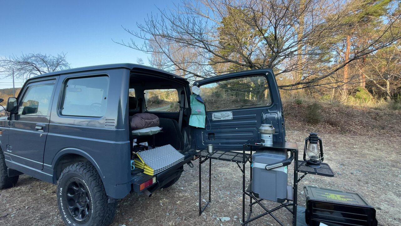 筆者はジムニーのバックドアを開放して景色を眺める時間がお気に入り。ドアの陰にいると視線と風が遮られプライベートな秘密空間を手にしたような気持ちになり、ワクワクします。何かとカスタムしたがるタイプなので、もっとこのスペースをグレードアップできるのではと思い、以前からプランを考えていました。