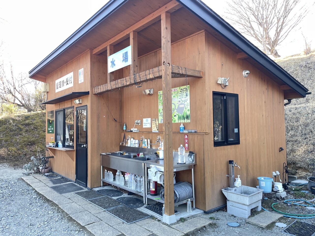 この管理棟にはトイレと水場が完備され、近くにシャワー室(25分 500円)も設置されています。これだけの環境でありながら全ての宿営サイト(場所)が1500円というリーズナブルな価格で泊まれるのはありがたい。