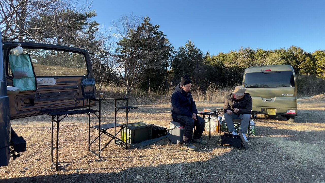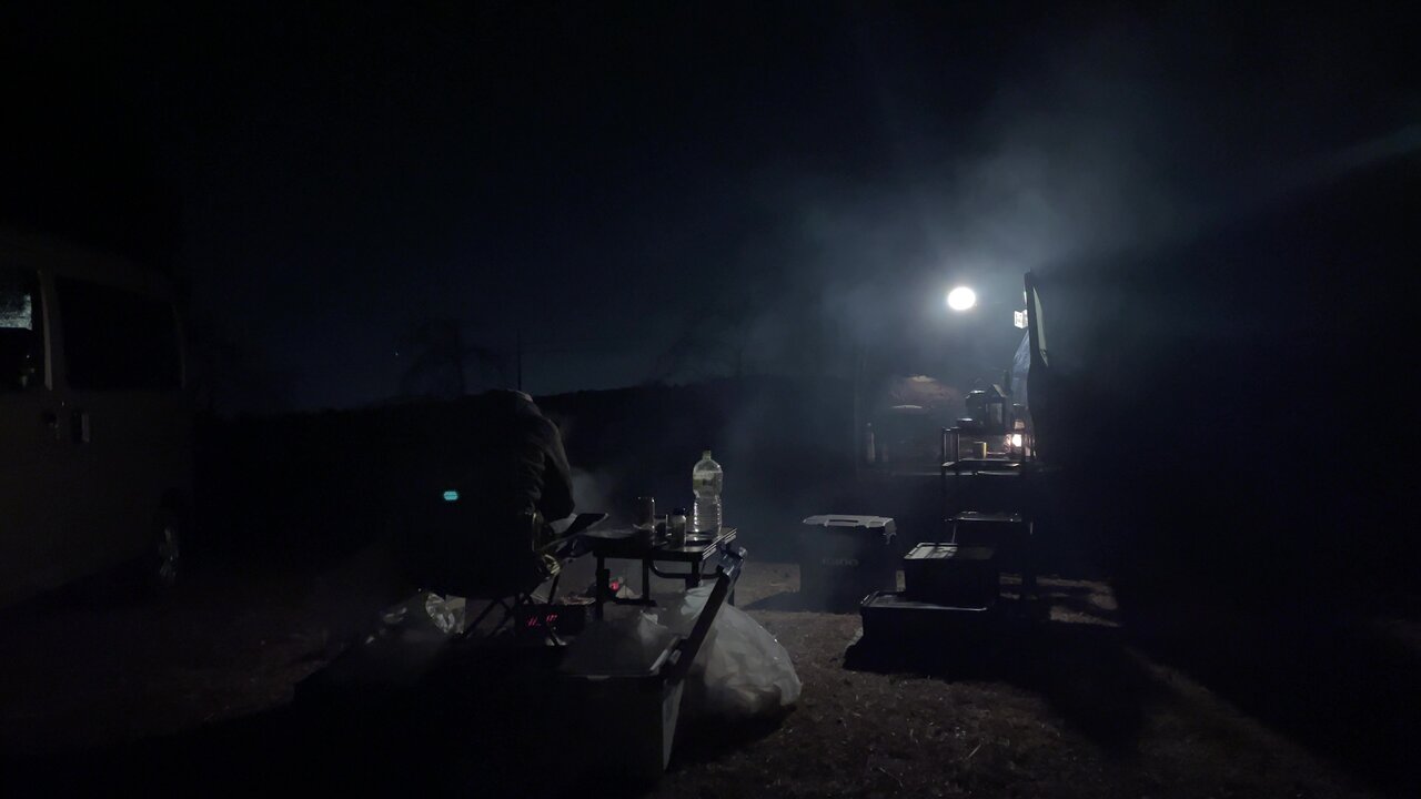 夜が更けてきて気温がかなり低くなりました。この日、日中は春の暖かい陽気を感じましたが、夜は風が強く、かなり冷え込んできました。山間部にあるキャンプ地は真冬のような冷気が流れ込んできています。