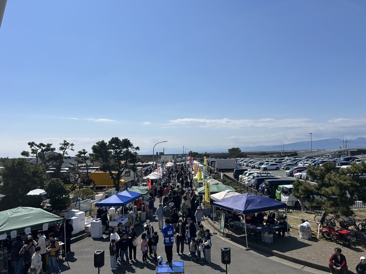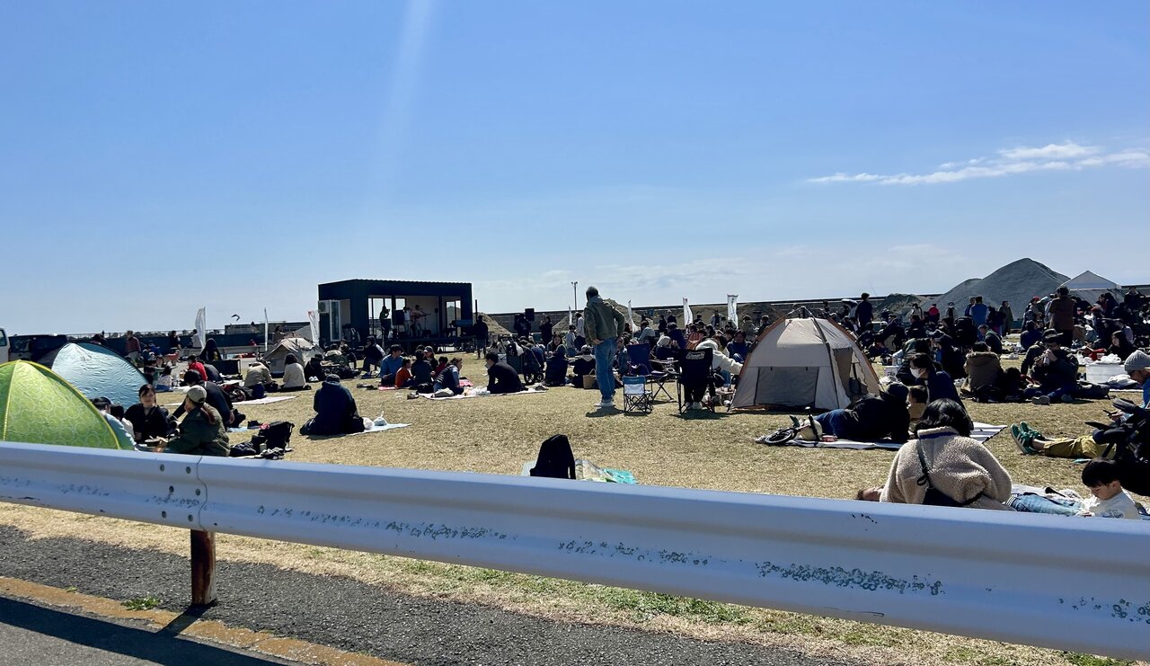 芝生のエリアでは、音楽イベントが行われていました。ポップアップテントやレジャーシートを設置して、大磯市で買ってきた食事を楽しんでいるようです。まだ肌寒さを感じる日でしたが、心地の良い日差しが降り注いでいるおかげで、居心地が良さそう。