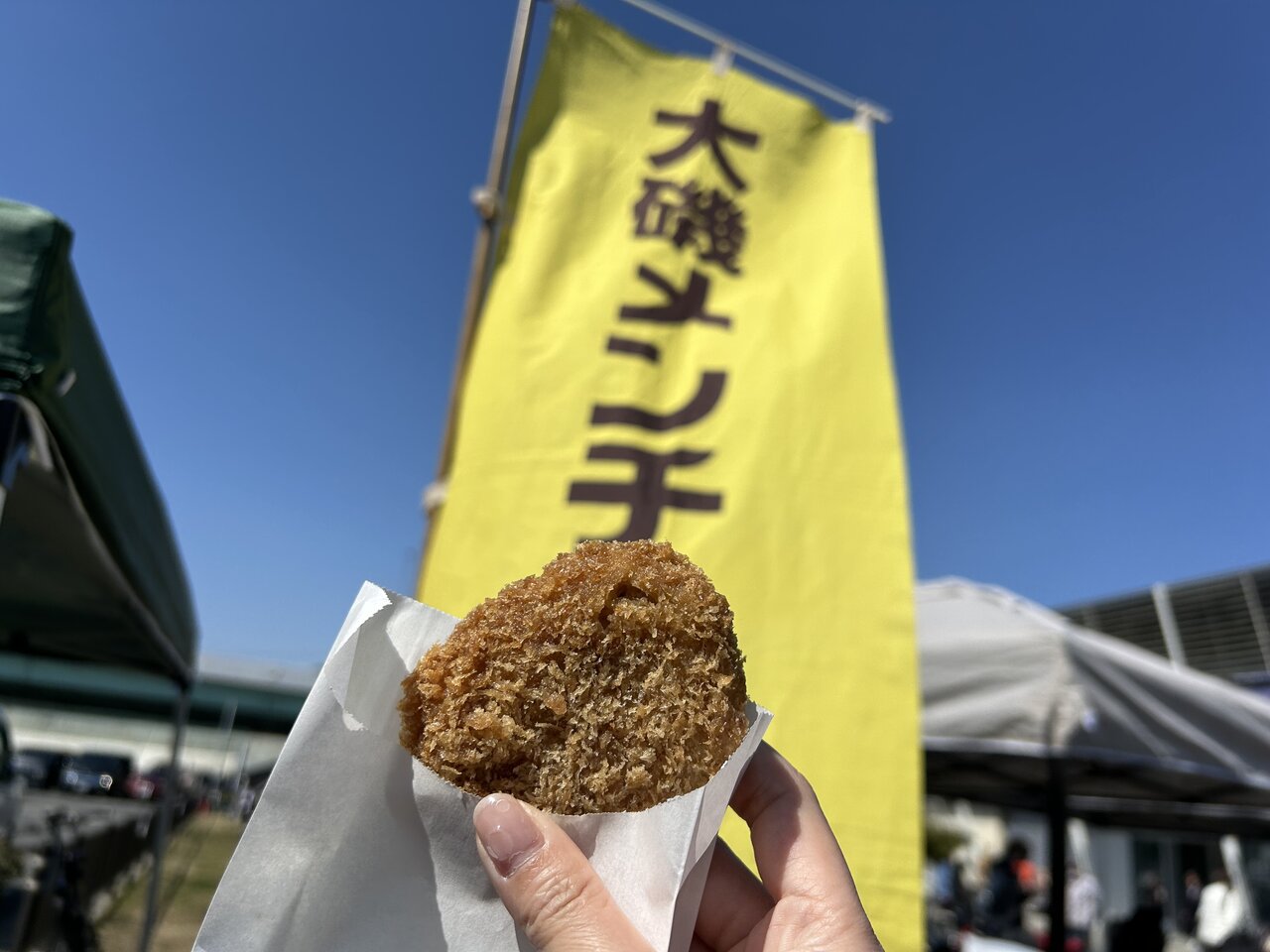 せっかくなので、大磯ならではのグルメをいただきたいところ。そこで目に飛び込んできたのが、大磯メンチののぼりでした。昭和11年創業のミートハウスささやさんが手掛けているよう。コロッケも気になっていましたが、「大磯メンチ」(120円)を買ってみました。