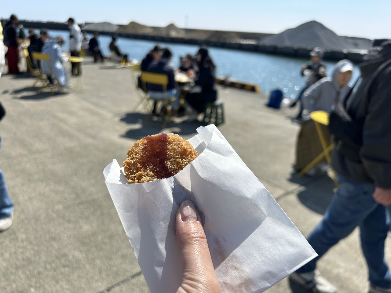 岸壁沿い釣りでは淡々と釣りを楽しんでいる人の姿も。普段は釣り人だけの静かな場所であるはずの港ですが、大磯市の開催日は熱気に包まれているのでしょう。すぐ近くで食事を楽しむ人や犬連れの人たちが思い思いに過ごしていて、そのごちゃまぜ感がなんともユニークです。