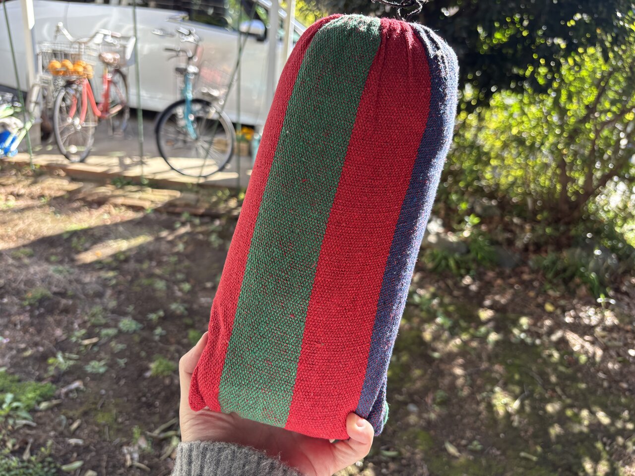 ハンモックは収納時で約32×17cmほど。手にした瞬間、「これがハンモックなの?」と少し驚きました。ハンモックというと、大きな布や重たい道具を想像していたのですが、ダイソーのは小さなバッグのようなサイズです。初めてハンモックに触れる人にとっては、このコンパクトさは意外かもしれません。