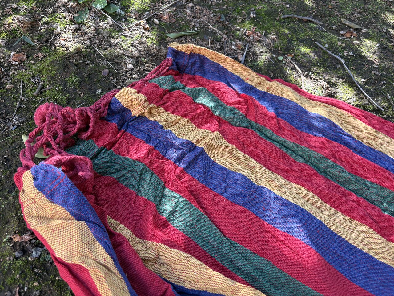 材質は綿・ポリエステル・レーヨンの混合素材。最近はカラビナやベルトがすべて揃ったオールインワンのハンモックセットも多く販売されていますが、これは必要最小限の内容です。その分、設置する場所や結び方は少し工夫が必要になるかも。
