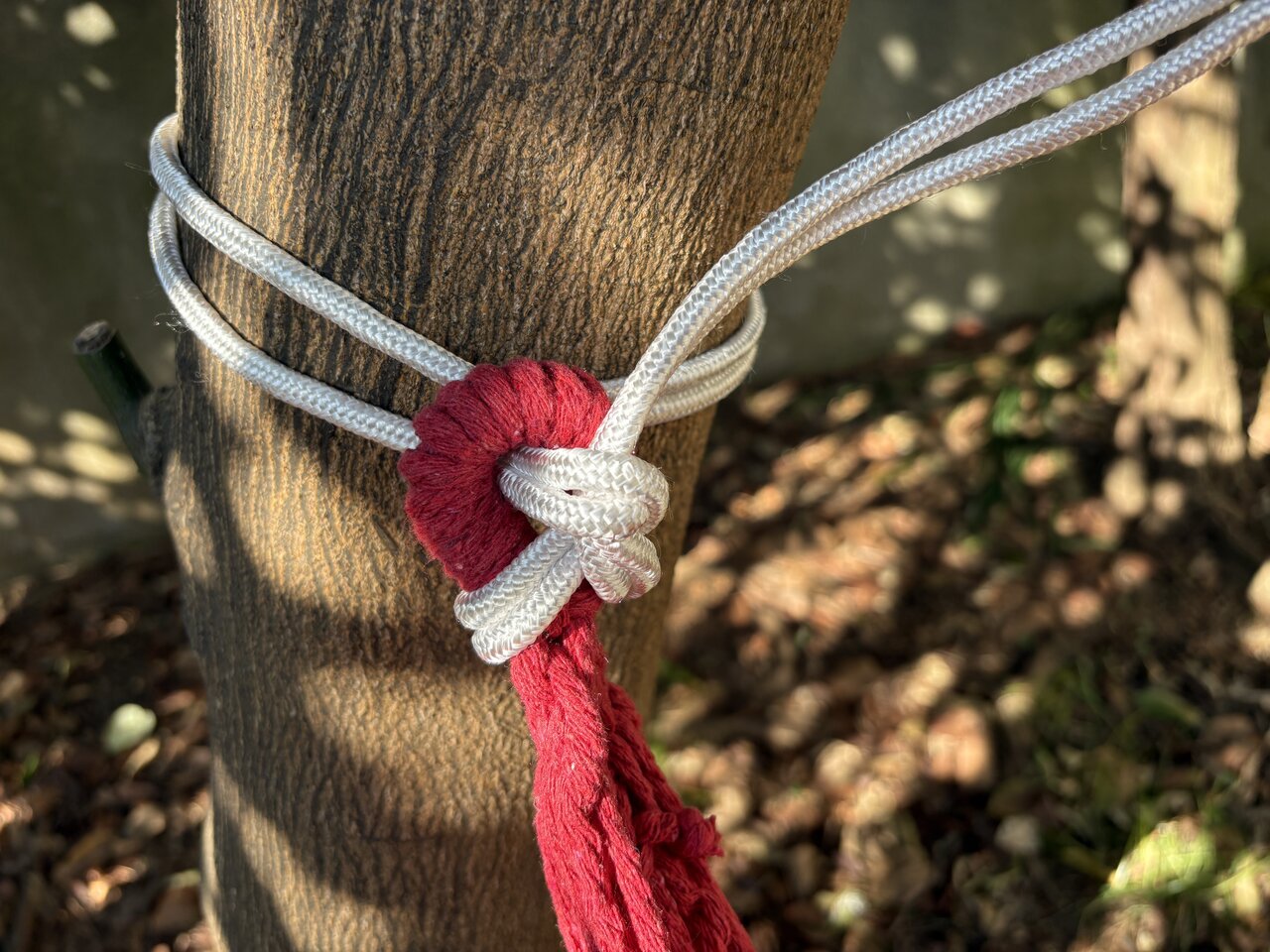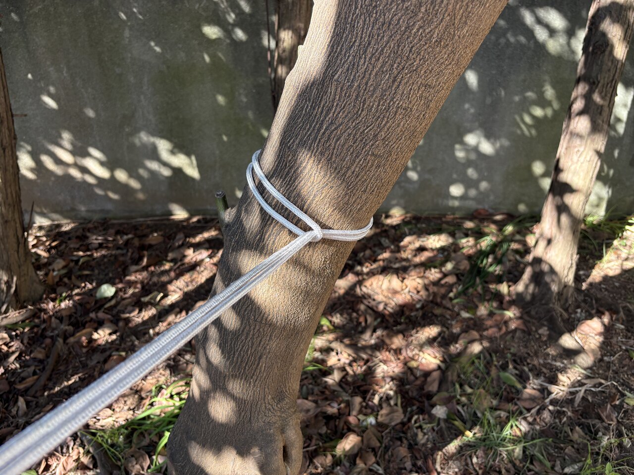 まずは付属のロープを使って、木に固定していきます。ロープを半分に折り、木の後ろ側へ回します。次に半分に折ったロープの輪をにロープの端を通します。木に輪を押し付けるようにして、ギュッと締めるだけで固定完了。シンプルですが、ある程度は木に固定できます。続いて、ロープとハンモック本体をつなぐ作業です。