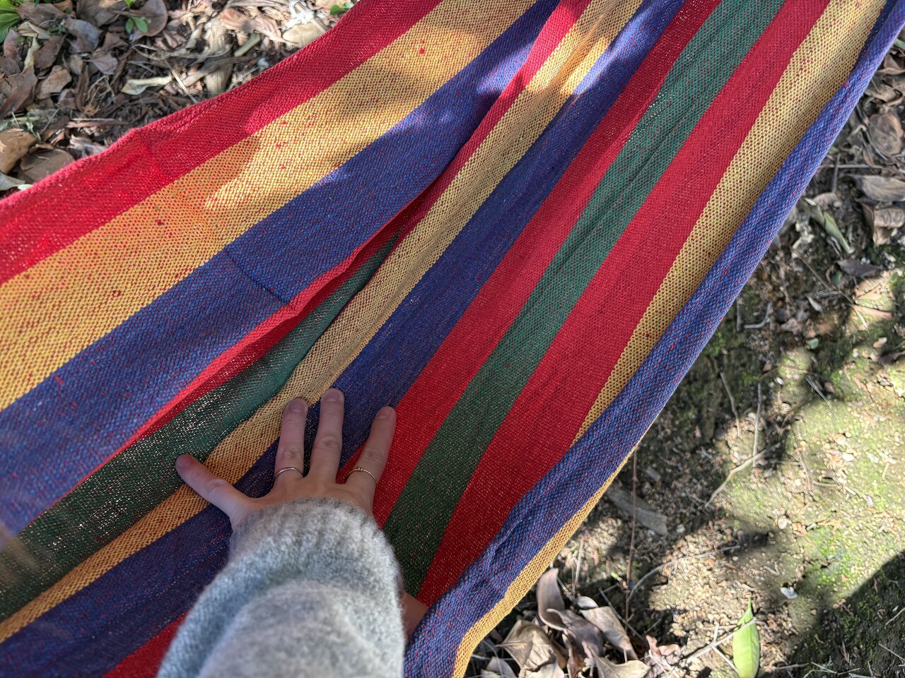 実際に座ってみると、今まで見たことがある支柱のあるようなハンモックより、幅が少し狭く感じました。それでも、体を預けると布がゆっくりと揺れます。
