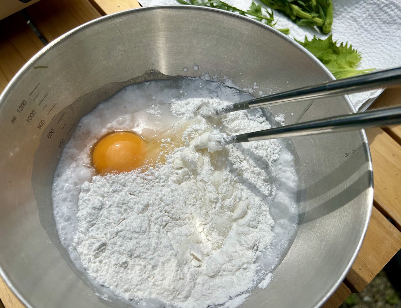 さっそく、衣を作っていきましょう。ボウルに材料を入れたら、あえてダマが少し残るくらいにザックリとかき混ぜるのがコツ。