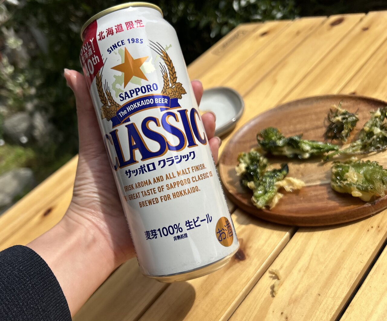 サクサクの衣をまとった、旬の菜花とクレソンの天ぷらが完成です。せっかくなので、家族からもらった北海道限定ビールと自家製お稲荷さんと一緒にいただきましょう。最高の組み合わせを前に、思わず顔がほころびます。