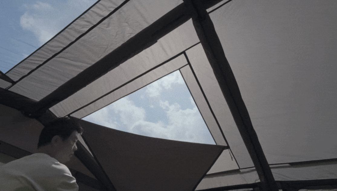 天井部分には、大きな天窓を装備。ルーフシートにもTPUウィンドウが付いているので、ルーフシートを装着したままでも夜空を満喫。耐水圧5000mmのブラックコーティング仕様になっているため、雨や強い日差しからも、テント内をガードしてくれます。