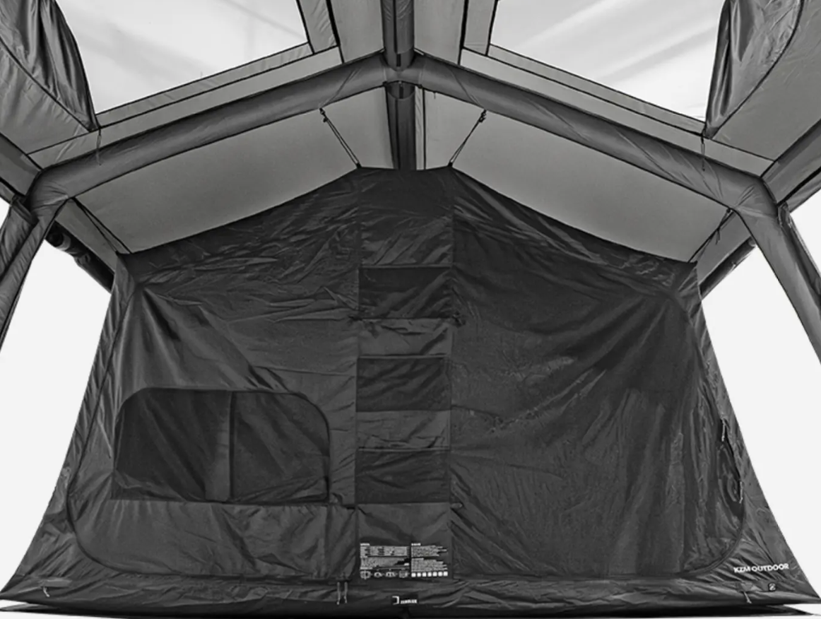「KZM エアテント」は、エアテントに見えないスタイリッシュなデザイン。2つのリッジポールを採用することで、広々と過ごせる空間や耐久性を確保しています。