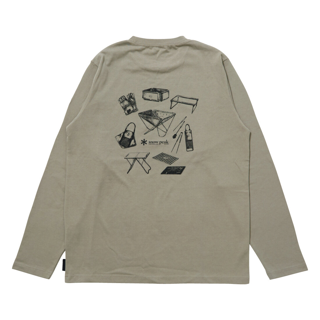 スノーピークを代表する、焚き火まわりのギアをプリントした長袖Tシャツ。肌寒くなる季節にピッタリで、ブランドファンならたまらない。