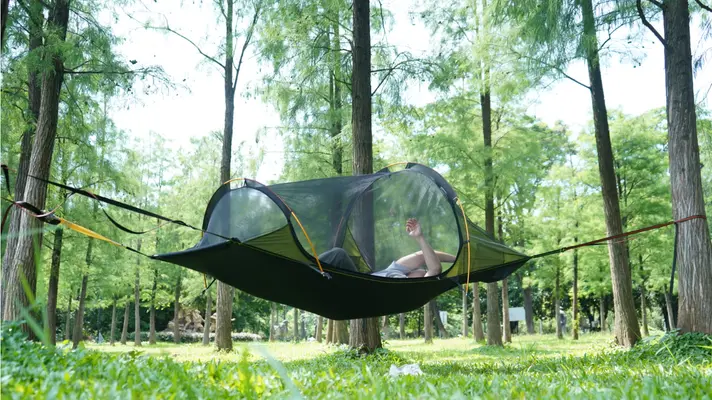 【空陸両用】雲に浮かんだようにふわふわ〜!設営3分でくつろげるハンモックテント