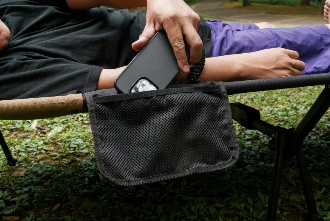 個人的にいいなと思ったのが、スマホやシュラフの収納袋、メガネなどの小物を入れておけるポケット。寝ている状態でも出し入れできるので、一時保管場所に使えます。あまりに居心地が良くて、一度寝転ぶともう動けなくなりそうだ!