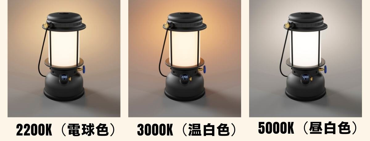 最大500ルーメンの明るさは、用途や気分に合わせて無段階に調整可能。光の色も、焚き火のようにあたたかい2200K、柔らかく温もりのある3000K、調理や読書に適した明るい5000Kの3種類から選べます。シーンに応じて最適な明かりを自在にコントロールできて重宝しそう。