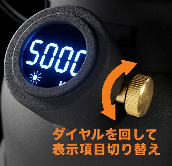 前面ディスプレイには、残り点灯時間やバッテリー残量、明るさ、色温度の順で情報を表示。ひと目で状況を確認できる分かりやすい設計です。操作もシンプルで、ホイールを動かすだけで表示の切り替えが可能。必要な情報をすぐに把握できます。ナイトキャンプや暗い場所でも使いやすそう。