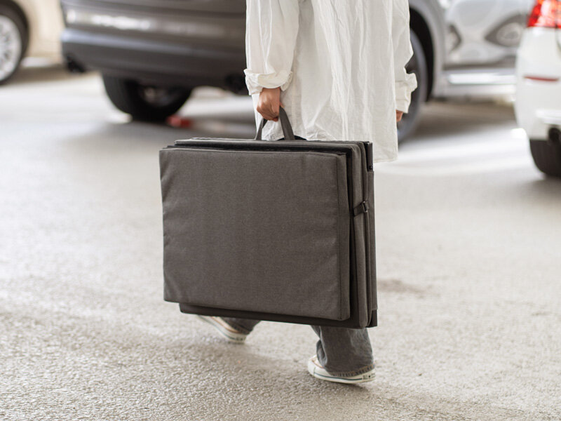 三つ折り構造で折りたたむと厚さ約13cmまでコンパクトになり、取っ手付きで収納や持ち運びも簡単です。