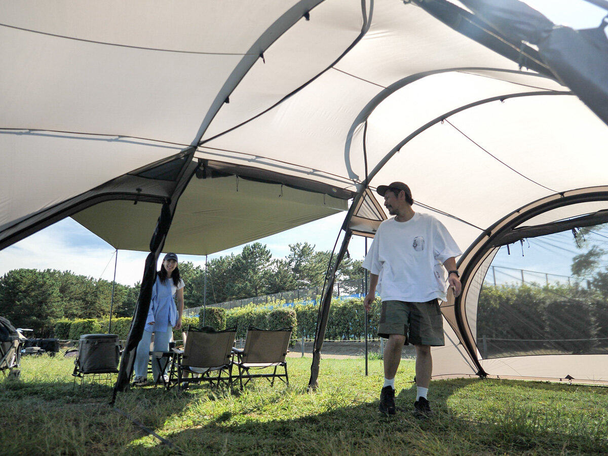 テント内でゆったり過ごしたい。そんな人におすすめしたいのが、アウトドアブランド RATELWORKS(ラーテルワークス) が手がける「MUSCHEL(ムシェル)」です。立って歩ける天井高や優美なカーブを描くシルエットが特徴。さらに、前後左右すべての出入口をフルオープンにできる構造を採用しており、好きな方向からスムーズな出入りが可能。荷運びも楽ちんです。