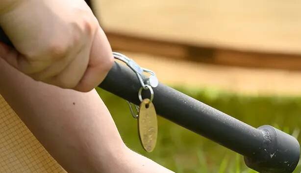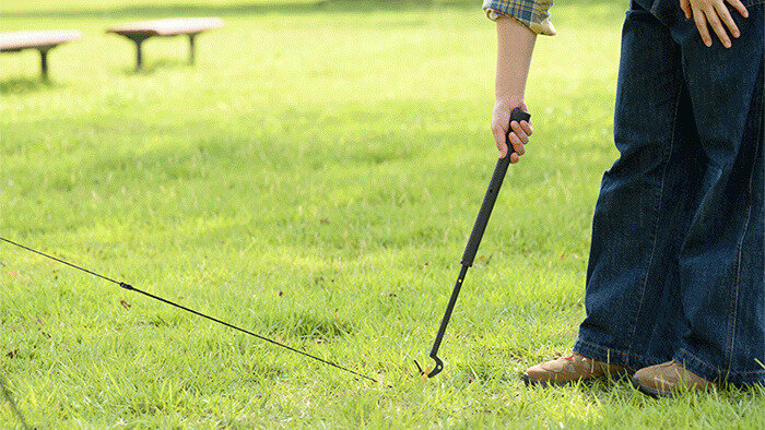 「メフリレPOM(ポン)」は、キャンプでの撤収時に腰への負担を減らしてくれるギア。使用時はフックをペグに掛け、シャフトを軽く一度縮めてから、手前にスライドさせるだけ。テコの力とシャフトの反発で、立ったまま「ポンッ」と抜ける仕組みです。