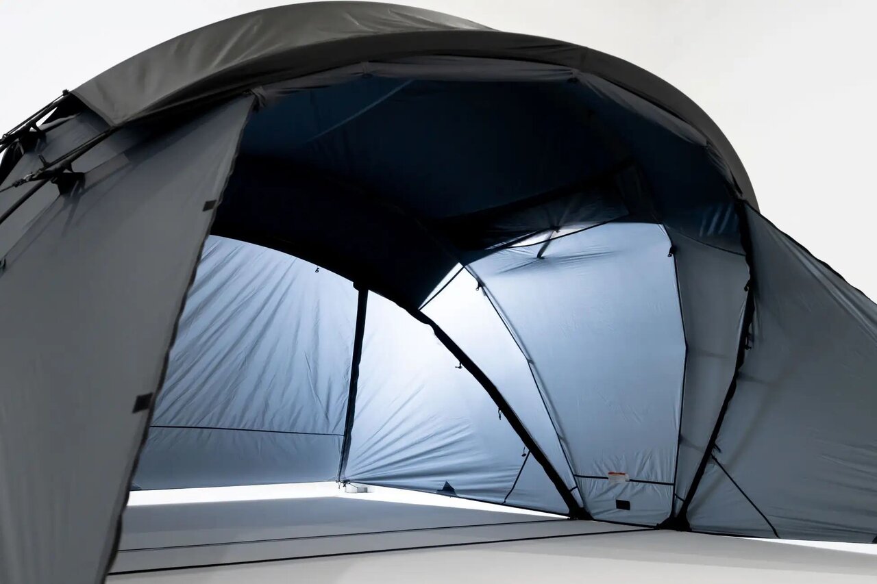 オプションのインナーテントは左右どちらにも取り付けでき、2つ装着すれば最大8人もが宿泊可能に。横幅350cmでファニチャーを置いても余裕たっぷりです。