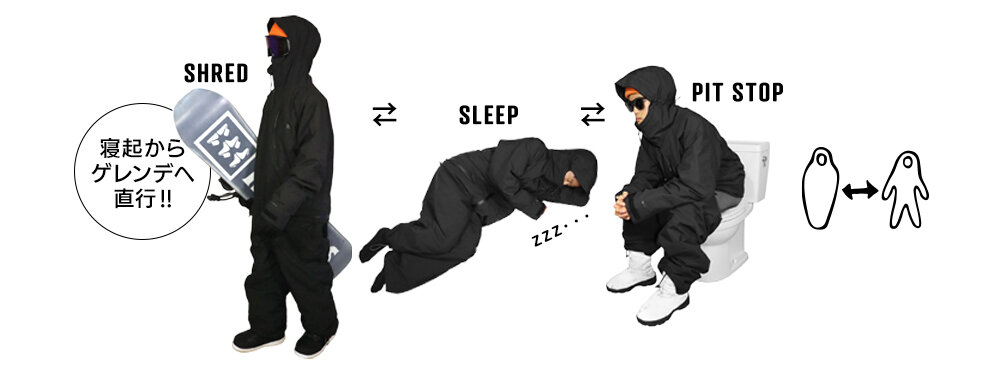 スノーウェアと人型寝袋が一体になった「フトンライダー」