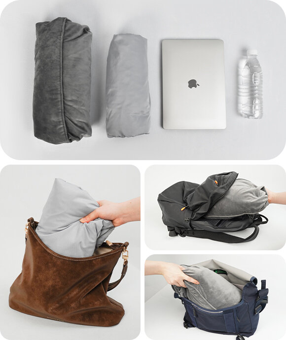 軽量でかさばらない設計のため、旅行・出張・アウトドア・クルマでの移動などで手軽に持ち運び可能。丸めてコンパクトにまとめられるので、バックパックの隅、スーツケースのポケット、クルマのグローブボックスにもすっきり収納できます。
