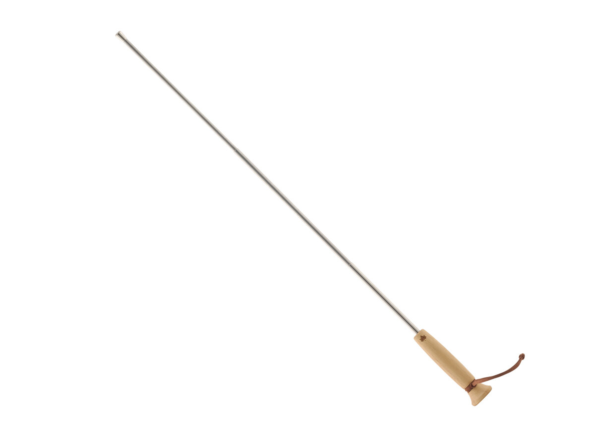 長さ約42cmと火床へしっかり届き、熱や汚れを気にすることなく薪を動かせそうです。革製のヒモ付きで吊るして保管することもできます。