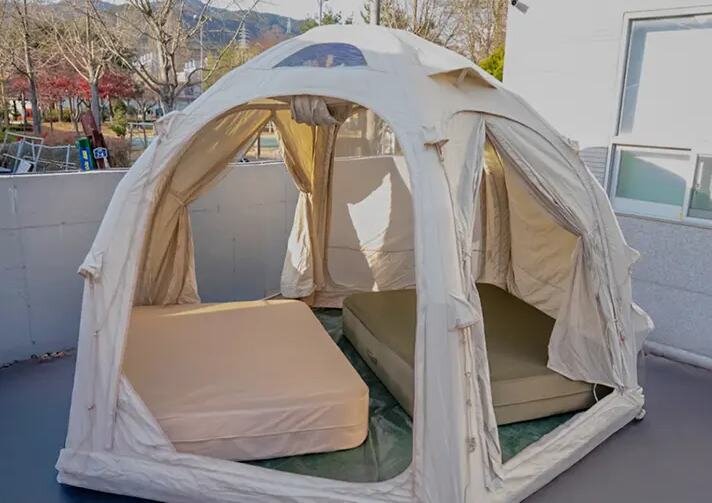 エアフレームは競技用ゴムボートにも使われる高耐久素材を使用し、テントを支えるポールは直径12cmでしっかりとした安定感。そのほか減圧弁や難燃性PVCなどISO国際基準をクリアした確かな安全性です。