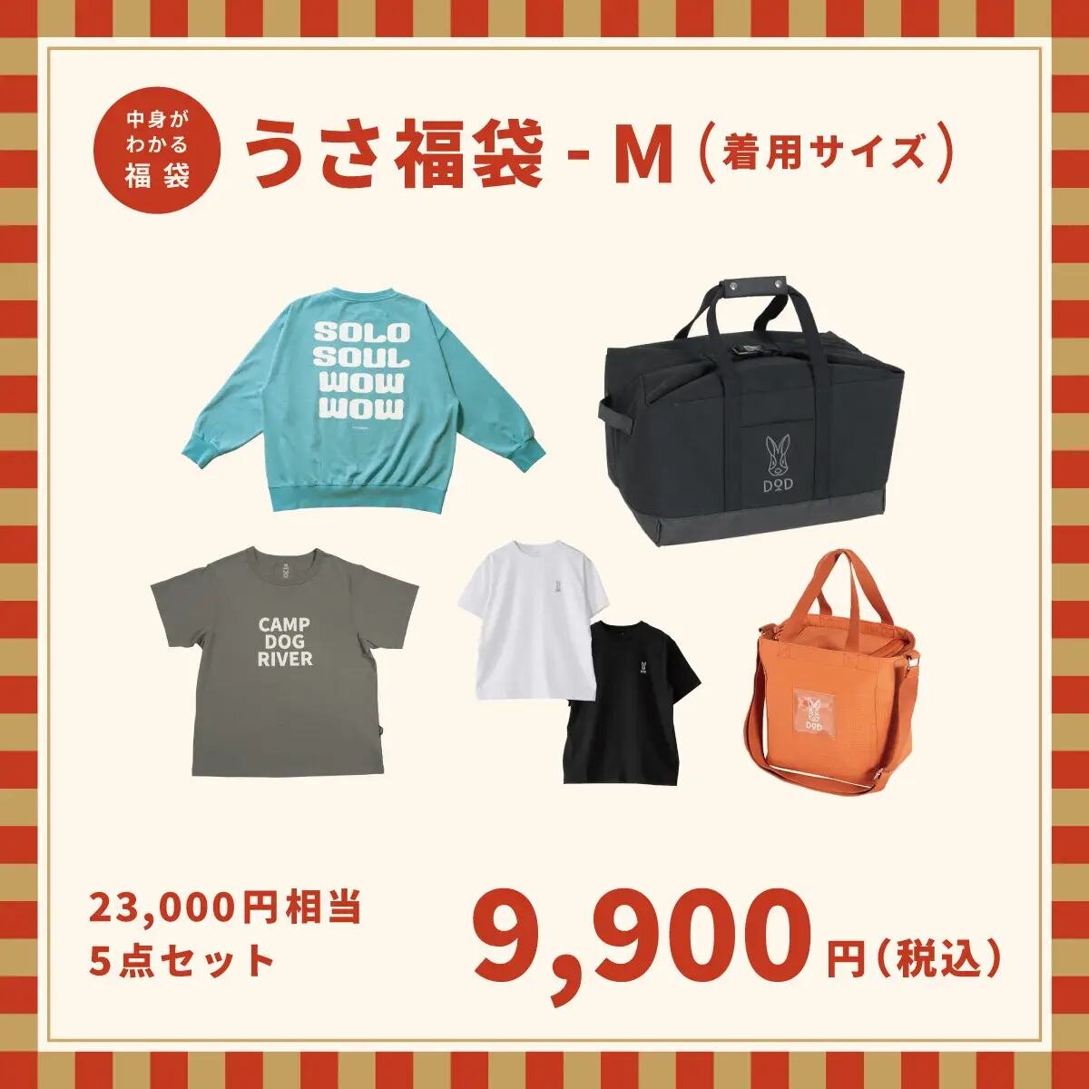 M、L、XLの4つのうさ福袋には日常で使えるアイテムが含まれていて、キャンプをしない人も楽しめます。全て2万円以上のアイテムが入った5点セットで、アイテムはうさ福袋ごとに異なり、洋服のサイズは福袋の表記通りです。