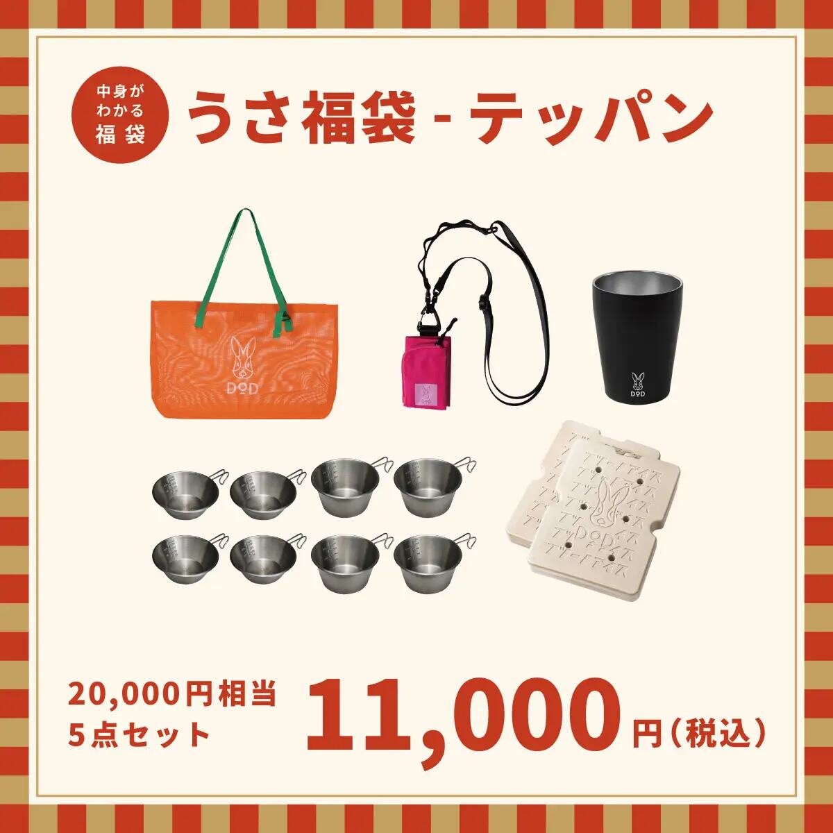 その名の通り、DODのテッパンアイテムが詰まった「うさ福袋-テッパン」。定価で約2万円相当のアイテムが入っているのでかなりお得です。来年こそキャンプデビューを目指す初心者に最適な5点セットです。