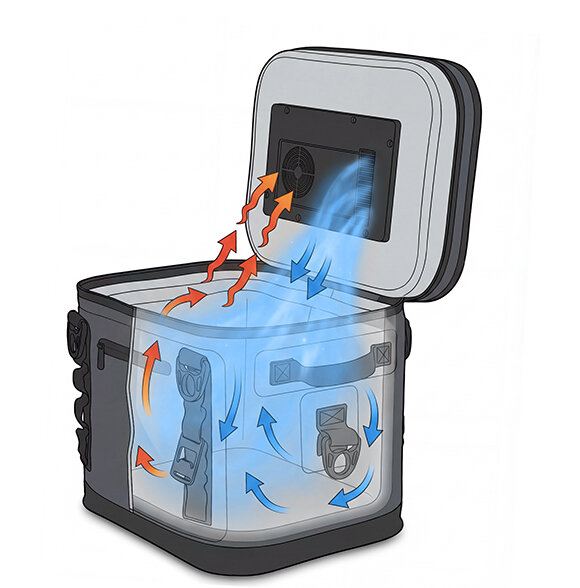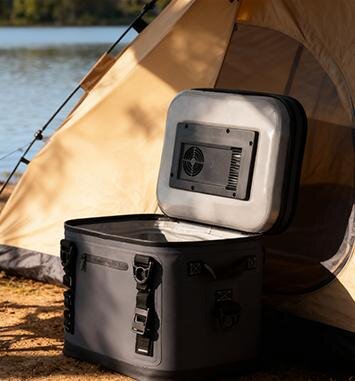 上部に搭載された熱交換システムとペルチェ素子モジュールが熱を効率よく逃がし、庫内をスピーディに冷却。空状態なら25℃から5℃まで約45分。330ml缶3本入りでも約3.5時間で5℃前後まで冷却できます(14Lタイプの場合)。家の冷蔵庫並みの冷却性能で、移動中に冷やし、到着後すぐ冷たいドリンクを楽しめます。