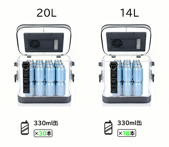 容量は選べる2タイプ。330ml缶なら14Lで18本、20Lなら30本とたっぷり収納できます。14Lはデイキャンプやハイキングなど、日帰りのレクに、20Lなら週末のキャンプシーンにぴったりです。