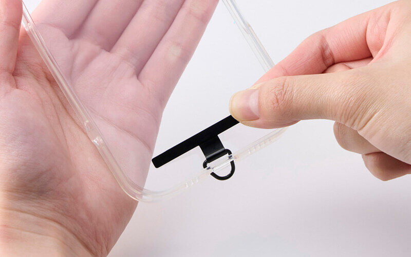 ケースにストラップホールがなくても、スマートフォンとケースの間に薄型ストラップホールシートを挟むだけで準備は完了。ストラップホールシートを挟んだままでも充電できるため、スマートに使えます。